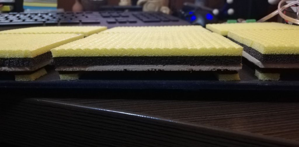 — как делаем пэды из фанеры? На одну сторону фанерки клеим звукоизоляционный (мягкий) лист, на другую, ножки из того же листа и по центру пьезодатчик. Садил все на суперклей не жалея. Каждую ножку, желательно сделать вдвое выше чем у меня, или из более мягкого листа, чтобы максимально уменьшить вибрацию основания от удара по пэду, это даст меньше ложных срабатываний у других датчиков)