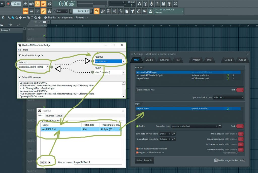 Открываем LoopMidi и создаем в Setup новое «Виртуальное» миди устройство. Открываем Hairless Midi и выставляем COM port куда пишет Ардуино и LoopMidi на вывод. Бьем по нашим электро барабанам и видим мигание индикаторов, значит все прошло как надо)